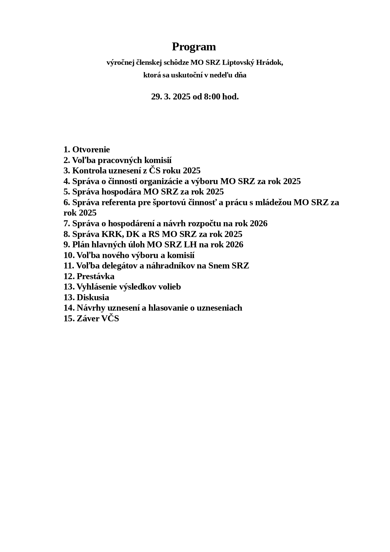 Týmto Vás pozývame na výročnú členskú schôdzu (VČS) MO SRZ Liptovský Hrádok, spojenú s voľbami do výboru a voľbou delegátov na Snem SRZ, ktorá sa uskutoční dňa 29. 3. 2026 od 08.00 hod. v Reštaurácii Urban, ul. Pod lipami 64, 033 01 Liptovský Hrádok, na 1. poschodí.